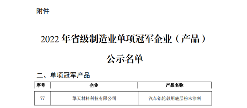 近日,廣東省工業(yè)和信息化廳公布了《關(guān)于2022年省級(jí)制造業(yè)單項(xiàng)冠軍企業(yè)(產(chǎn)品)通過(guò)名單》。擎天材料科技有限公司“汽車(chē)鋁輪轂用底層粉末涂料”憑借較高的技術(shù)水平、優(yōu)異的產(chǎn)品質(zhì)量、較高的市場(chǎng)占有率以及良好的應(yīng)用口碑等,斬獲“單項(xiàng)冠軍產(chǎn)品”榮譽(yù)稱(chēng)號(hào)。